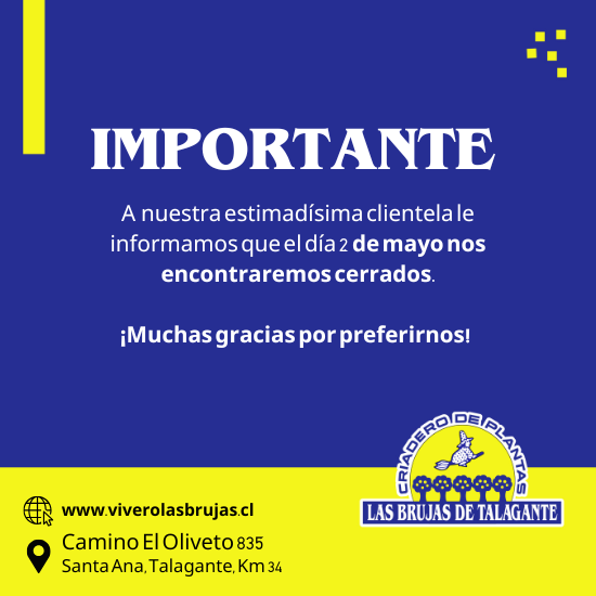 Una vez hecho el depósito o transferencia, por favor envíenos la colilla del depósito o comprobante al (56-2) 2817 24 89 o al mail Plantas@viverolasbrujas.cl; una vez recibida ésta, programaremos su despacho.