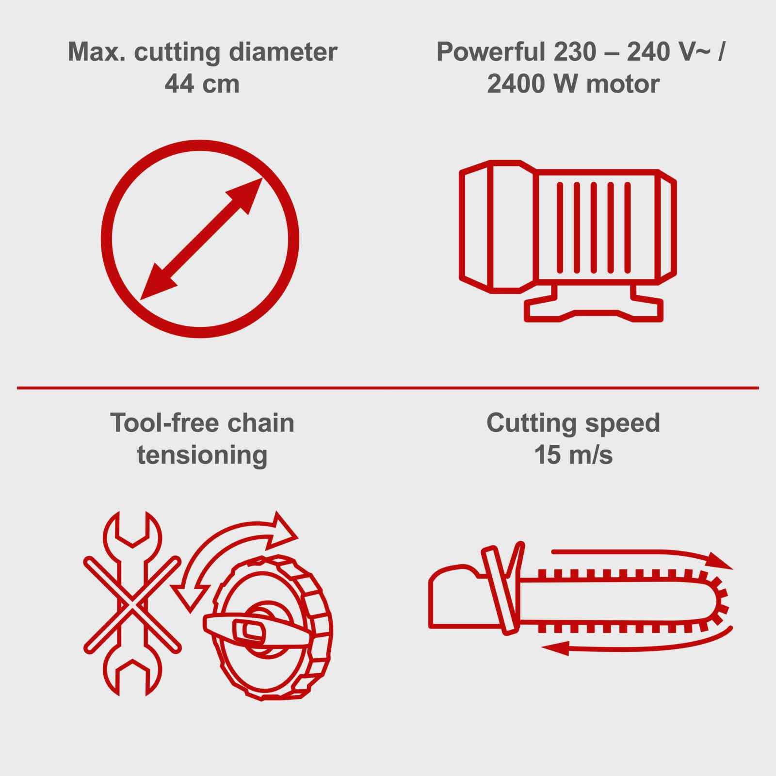 Con una espada de 18″ (45.5 cm) y una capacidad de corte de hasta 44 cm de diámetro, la CSE2600 es ideal para trabajos de jardinería, tala de árboles pequeños y corte de troncos para calefacción. Su velocidad de cadena de 15 m/s garantiza un corte rápido y eficiente, mientras que su sistema de tensión de cadena sin herramientas permite ajustes sencillos sin la necesidad de equipamiento adicional.